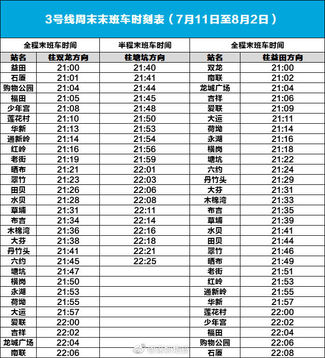 7月11日至8月2日 深圳地鐵3號線周末晚上9點(diǎn)結(jié)束運(yùn)營