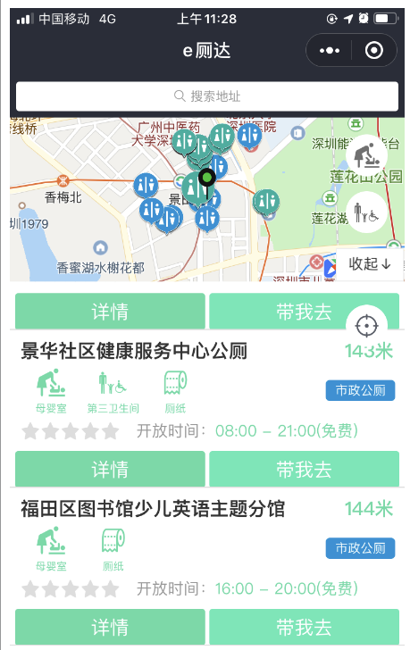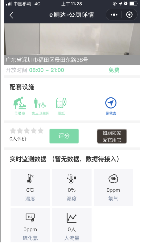 第二個(gè)功能是查看廁所情況。如果市民想知道廁所是否爆滿,有沒有母嬰室,衛(wèi)生情況如何,點(diǎn)擊任意廁所可查看每座公廁的詳細(xì)情況。