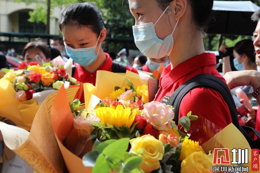 深圳高級(jí)中學(xué)考點(diǎn)外舞蹈隊(duì)學(xué)妹手捧鮮花,靜候?qū)W姐走出考場。