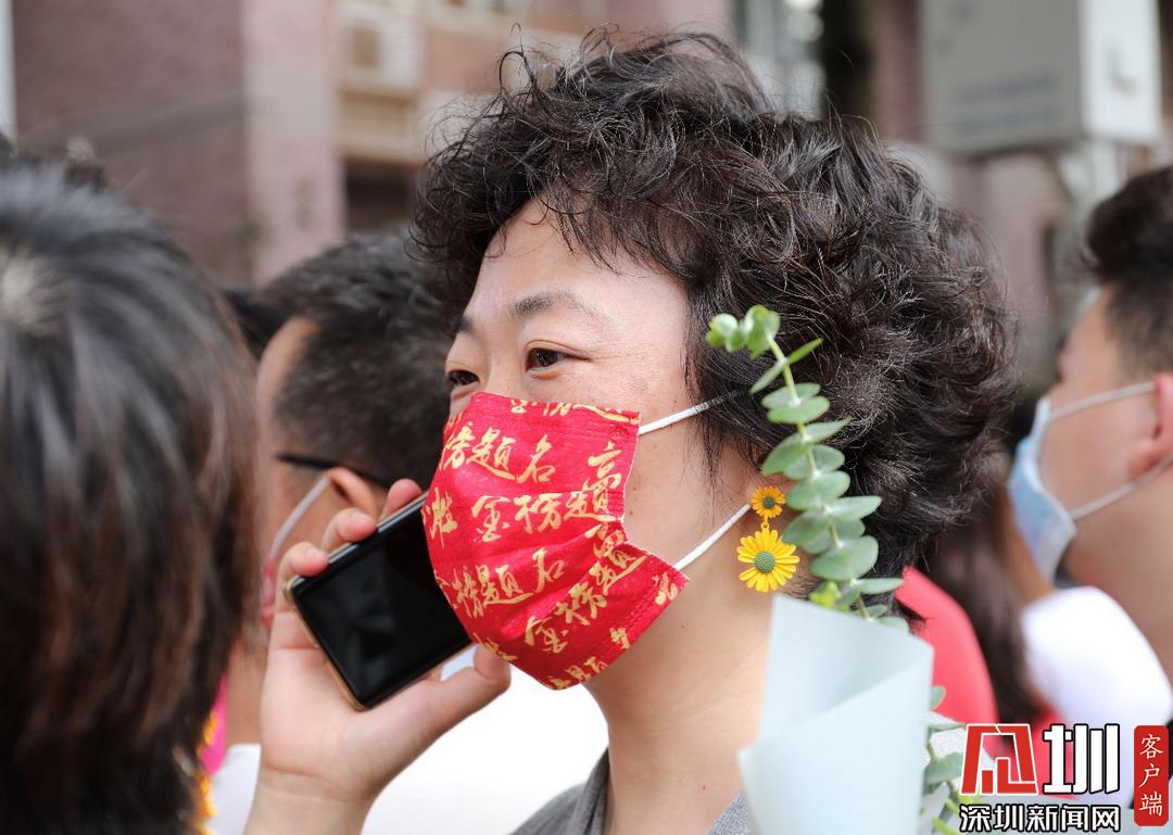 考點(diǎn)門(mén)口,家長(zhǎng)戴高考必勝紅色“金榜題名”口罩。