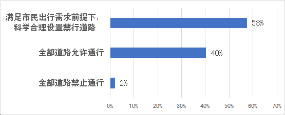 據(jù)調(diào)查,約58%的市民支持在滿(mǎn)足市民出行需求前提下,科學(xué)合理設(shè)置禁行道路;40%的市民認(rèn)為應(yīng)該全部道路允許電動(dòng)二輪車(chē)通行;僅2%的市民認(rèn)為電動(dòng)二輪車(chē)應(yīng)當(dāng)在全部道路禁止通行。