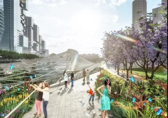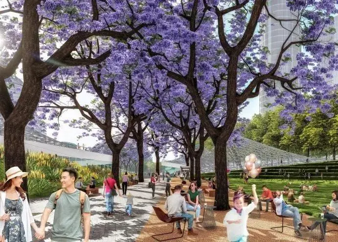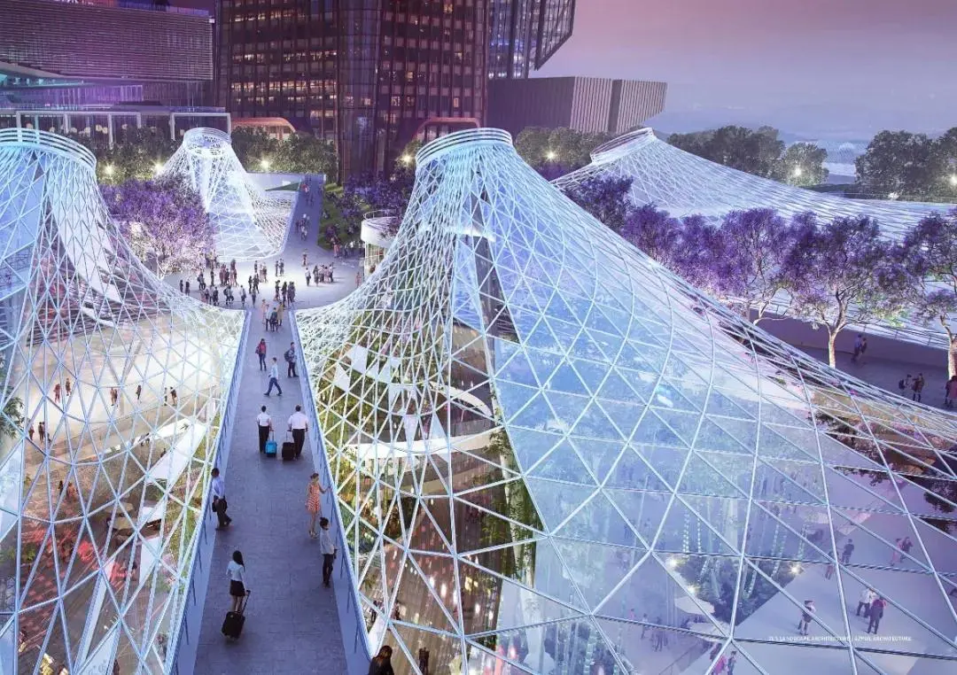為車站廣場,“水晶山丘”屋面覆蓋著地下車站樞紐大廳,同時也在地面創(chuàng)造出造型獨特的城市地標(biāo)。光影和夜景效果與交叉的藍花楹大道配合,打造一個極具設(shè)計感的交通集散空間。地下共享大廳、地下森林與地面廣場、周邊建筑建立視覺聯(lián)系,成為中央綠軸美景的一部分。
