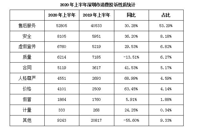 根據(jù)《情況分析》,2020年上半年,深圳市消委會收到的消費投訴問題性質(zhì)最多的為售后服務(wù),共52805宗,占比53.29%;其次為安全問題,共8105宗,占比8.18%;第三是虛假宣傳問題,共6760宗,占比6.82%。有關(guān)人格尊嚴(yán)問題、價格問題的投訴量與2019年相比均同比上漲超過60%;有關(guān)質(zhì)量問題的投訴量與2019年相比均有所下降。