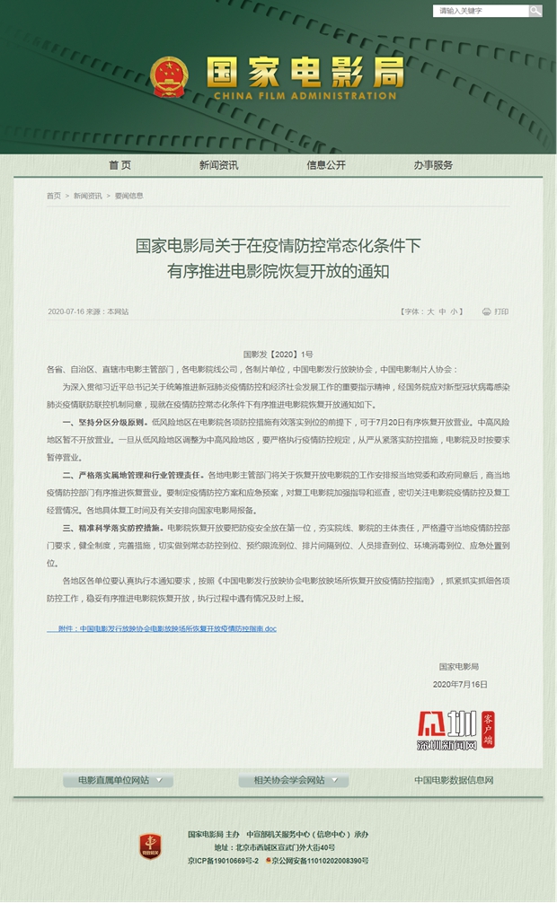 見圳客戶端·深圳新聞網2020年7月16日訊(見圳客戶端、深圳新聞網記者 張玲)好消息,低風險地區(qū)電影院可在7月20日恢復開放。7月16日,國家電影局官網發(fā)布《國家電影局關于在疫情防控常態(tài)化條件下有序推進電影院恢復開放的通知》,通知要求低風險地區(qū)電影院預約限流、排片間隔、人員排查以及環(huán)境消毒、應急處置等工作都要到位。