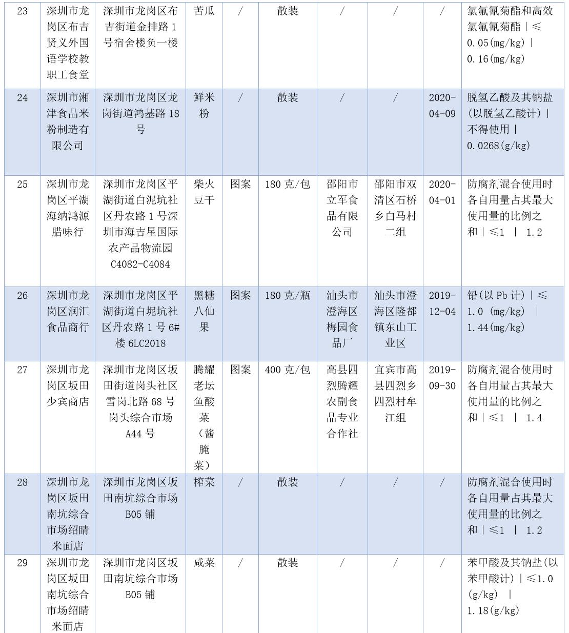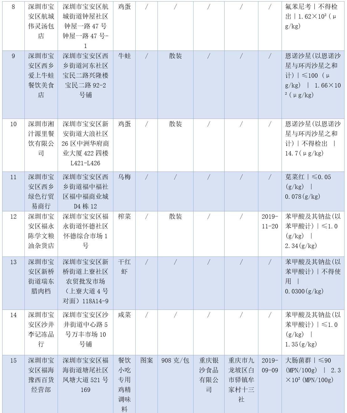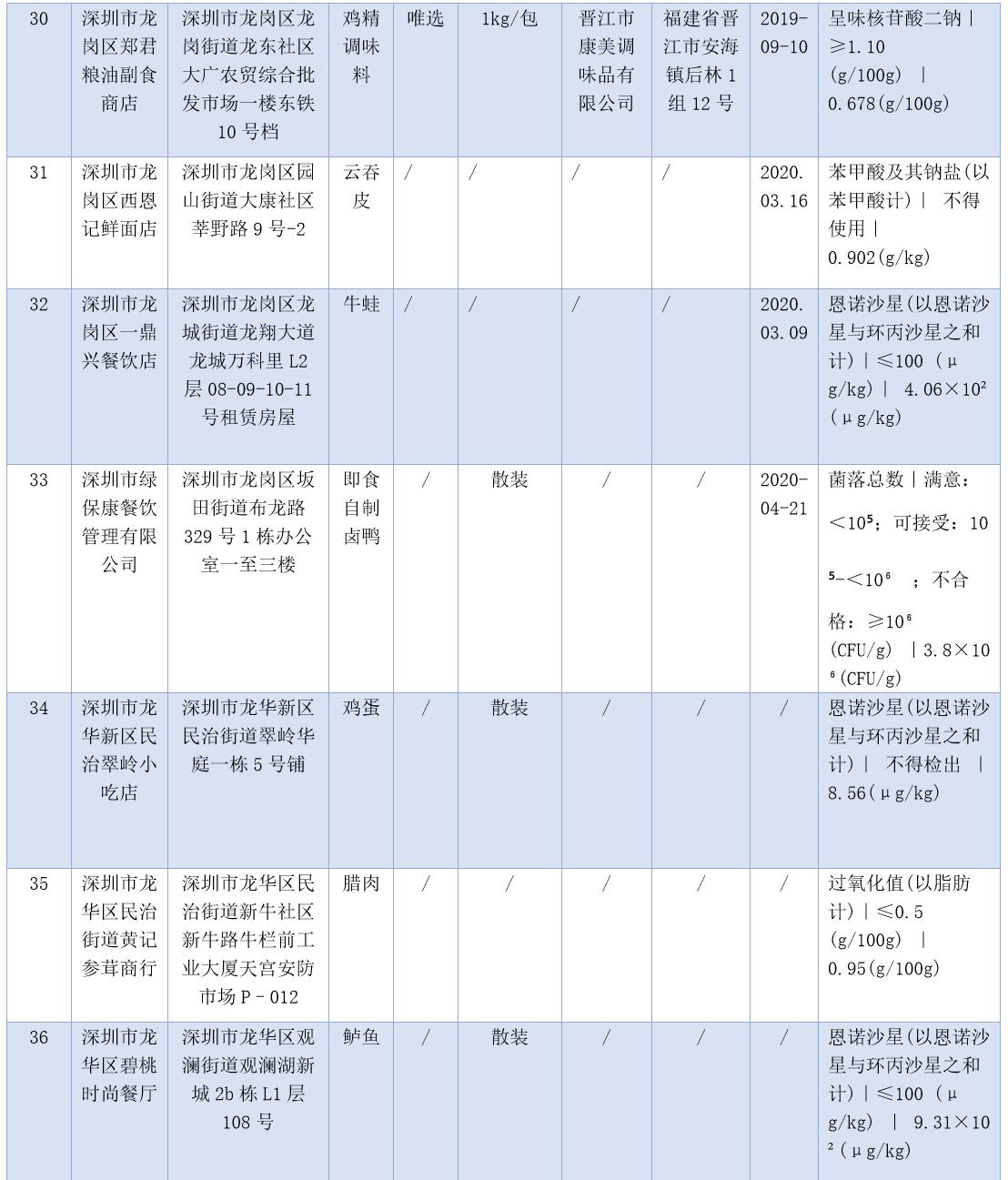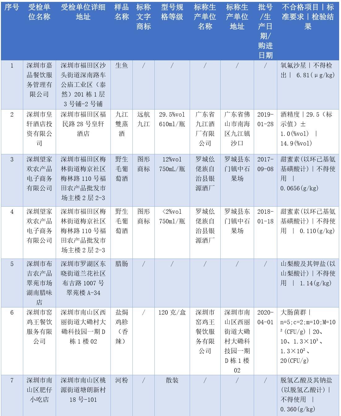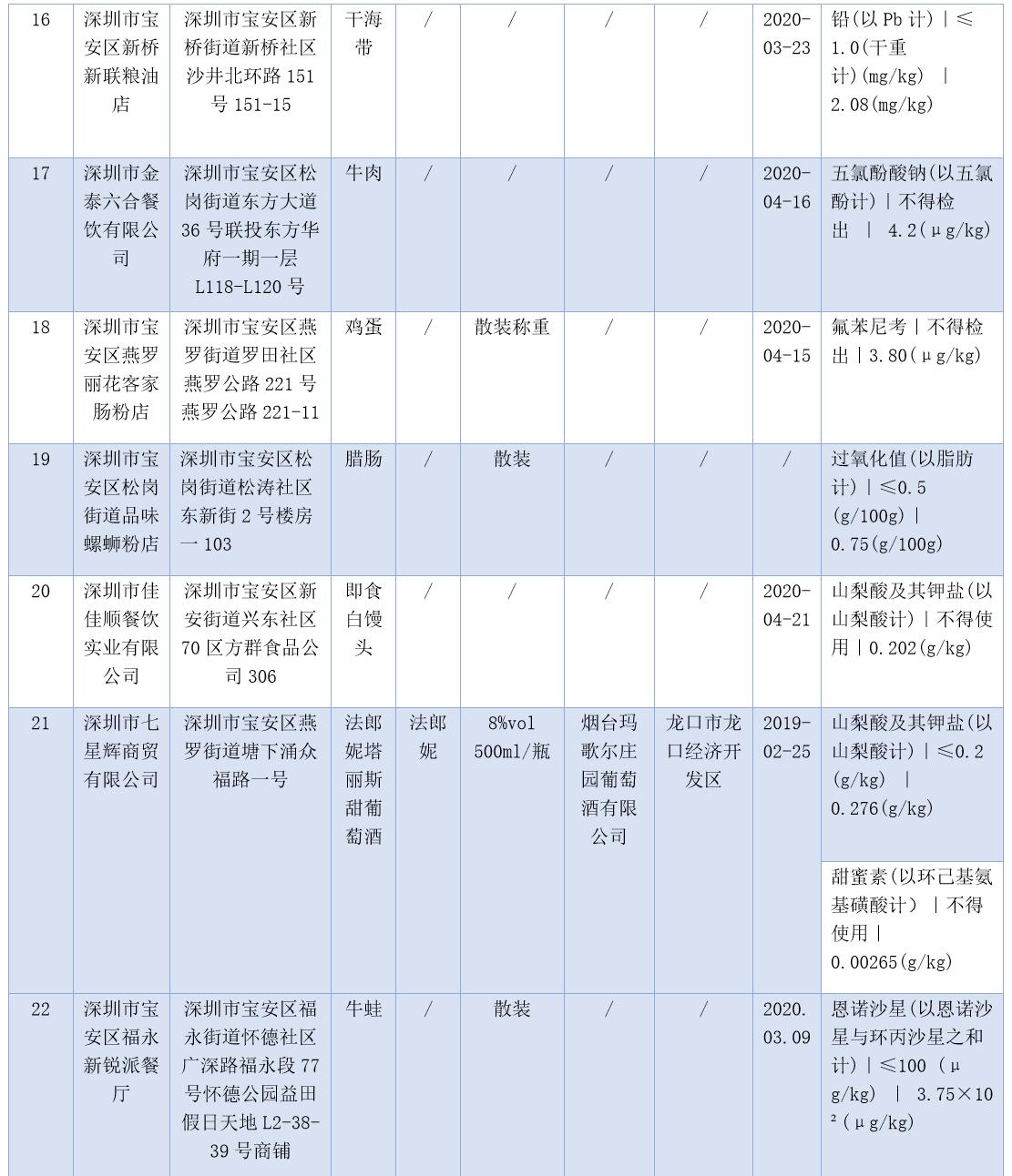 見圳客戶端·深圳新聞網(wǎng)2020年7月17日訊(晶報記者 鄧裴裴/制圖)7月17日,深圳市市場監(jiān)督管理局官網(wǎng)發(fā)布了2020年第二十二期食品安全抽樣檢驗情況通報,3-5月,共抽檢生產(chǎn)、流通、餐飲環(huán)節(jié)食品1229批次,發(fā)現(xiàn)不合格樣品47批次。記者注意到,不少不合格樣品抽檢單位為餐飲店,包括皇軒酒店、窯雞王、愛上牛蛙、御可奶茶等,還有些小吃店、腸粉店、螺獅粉店紛紛上榜。涉及不合格項目類別包括農(nóng)藥殘留、獸藥殘留、食品添加劑、微生物污染、品質指標、金屬等元素污染物。