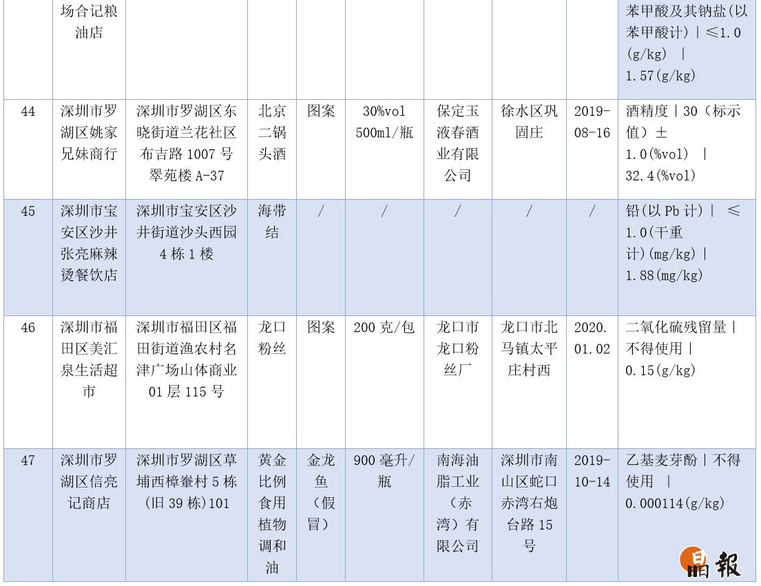 本次不合格樣品涉及的食物種類較多,臘腸、雞蛋、榨菜、酒等都檢出問題,值得注意的是,羅湖區(qū)草埔西樟輋村信亮記商店出售假冒的金龍魚油,檢出了不得使用的乙基麥芽酚,其標稱生產(chǎn)企業(yè)為南山區(qū)南海油脂工業(yè)(赤灣)有限公司,后經(jīng)核實,不合格產(chǎn)品非該公司生產(chǎn)。