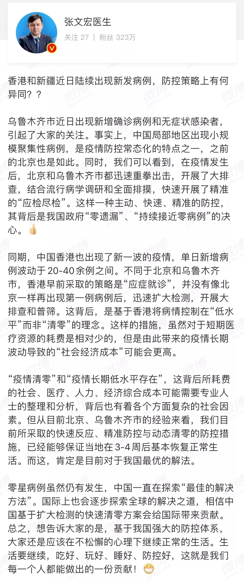 7月18日8時許,上海復(fù)旦大學附屬華山醫(yī)院感染科主任@張文宏醫(yī)生在微博上就“香港和新疆近日出現(xiàn)新發(fā)病例”發(fā)聲。
