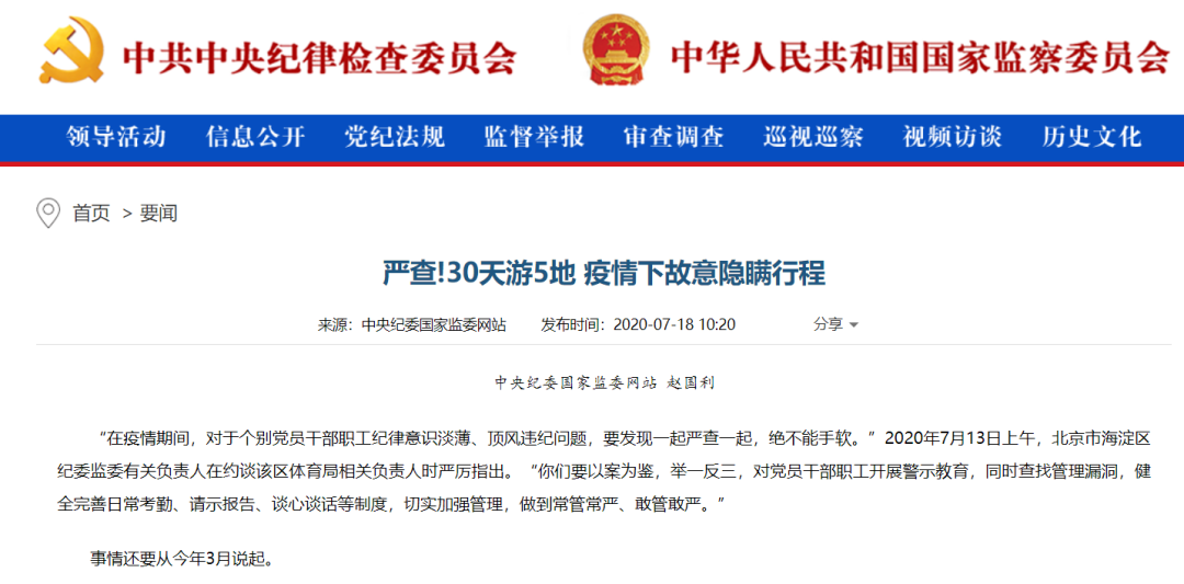 “疫情期間多次離京出國,回京后不向單位、社區(qū)報告,也不居家隔離……”2020年3月,正值全國上下防控新冠肺炎疫情的關(guān)鍵時期,北京市海淀區(qū)紀委監(jiān)委收到一條舉報線索,被舉報對象是海淀區(qū)體育局綜合管理服務(wù)中心工作人員駱某。