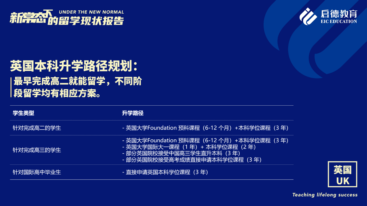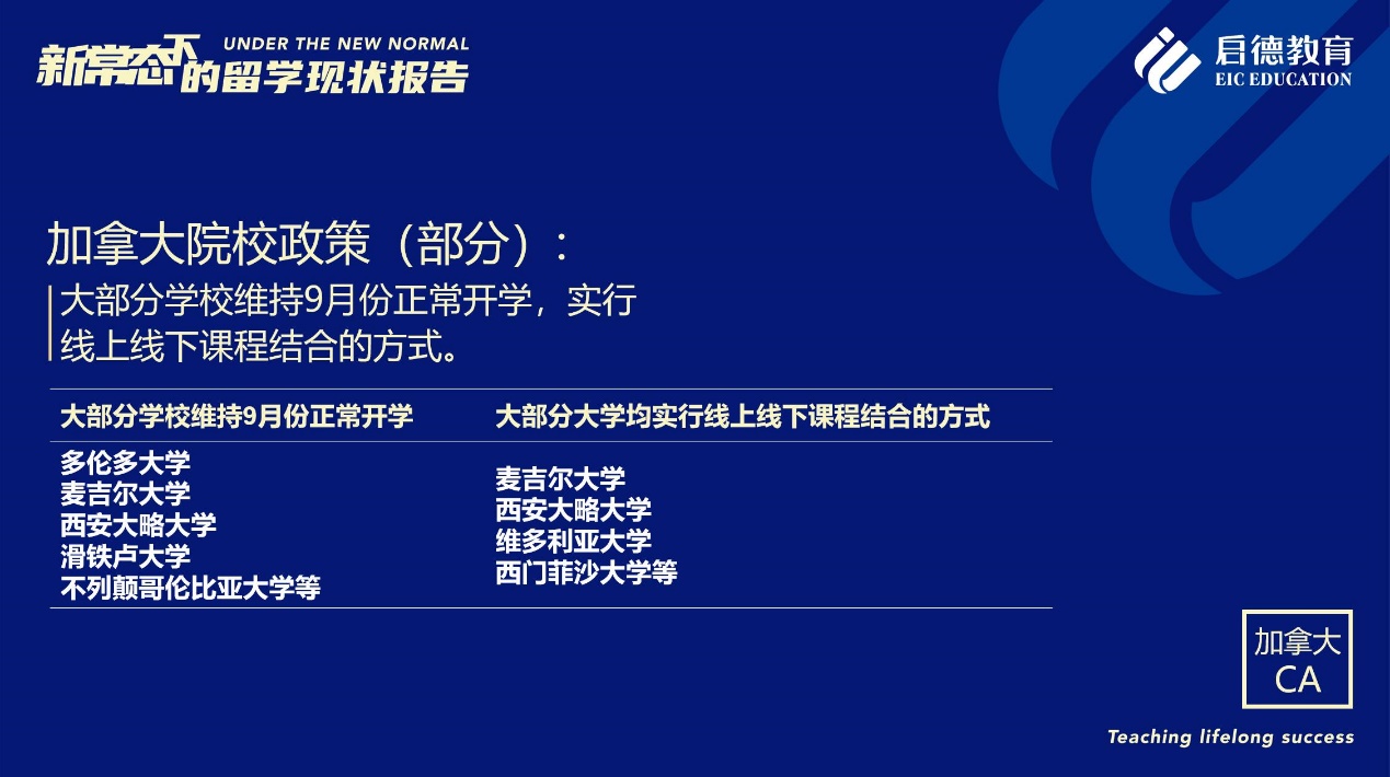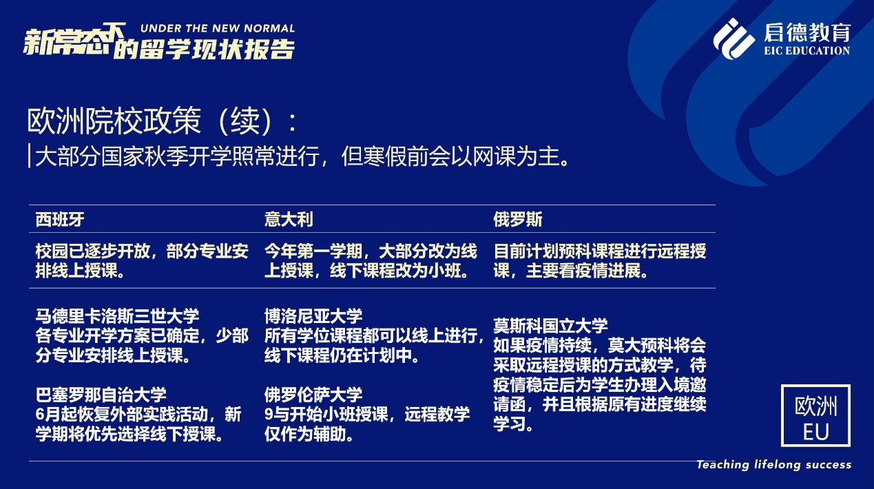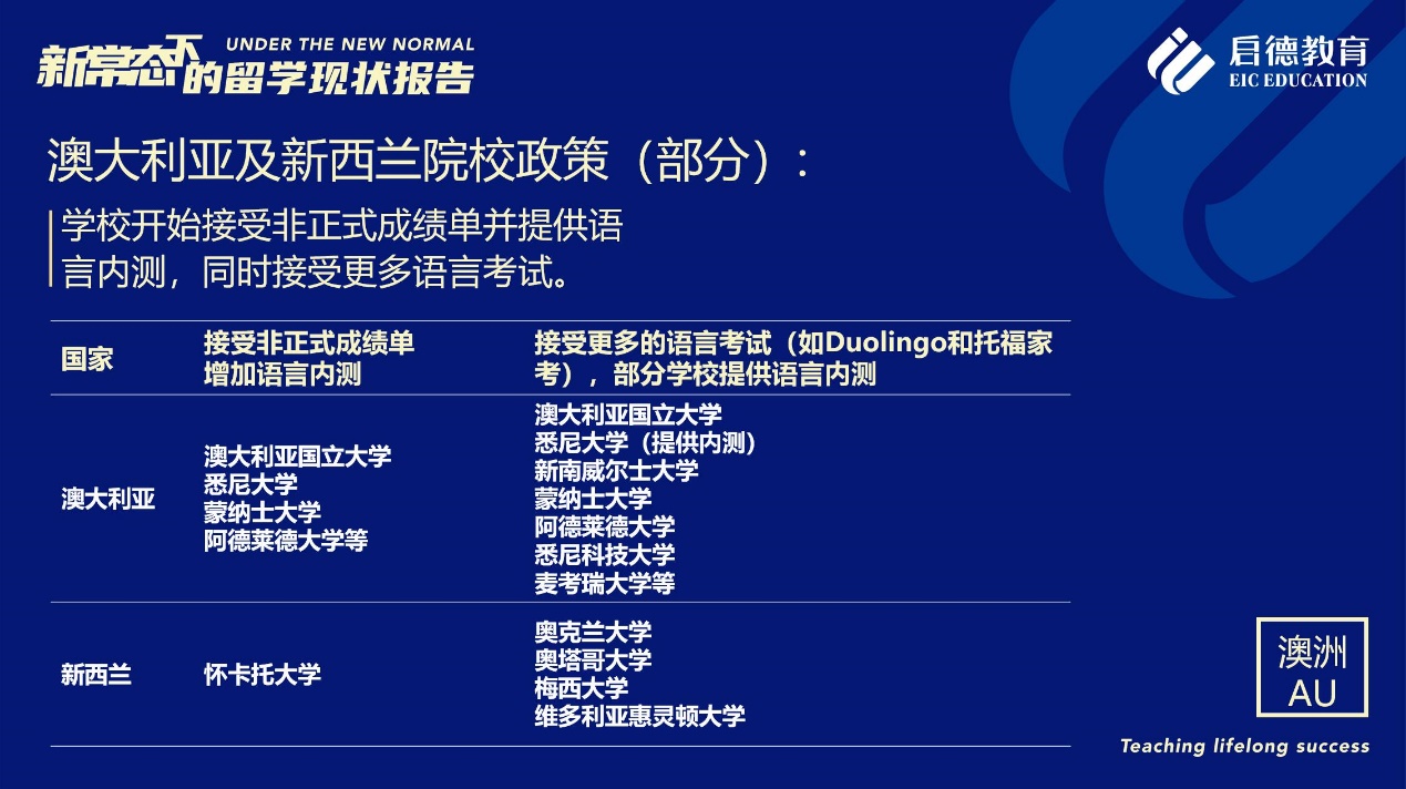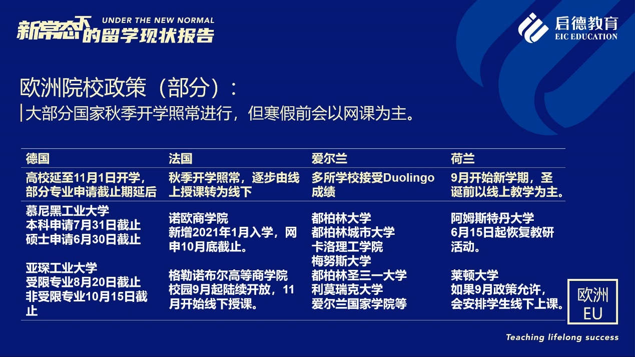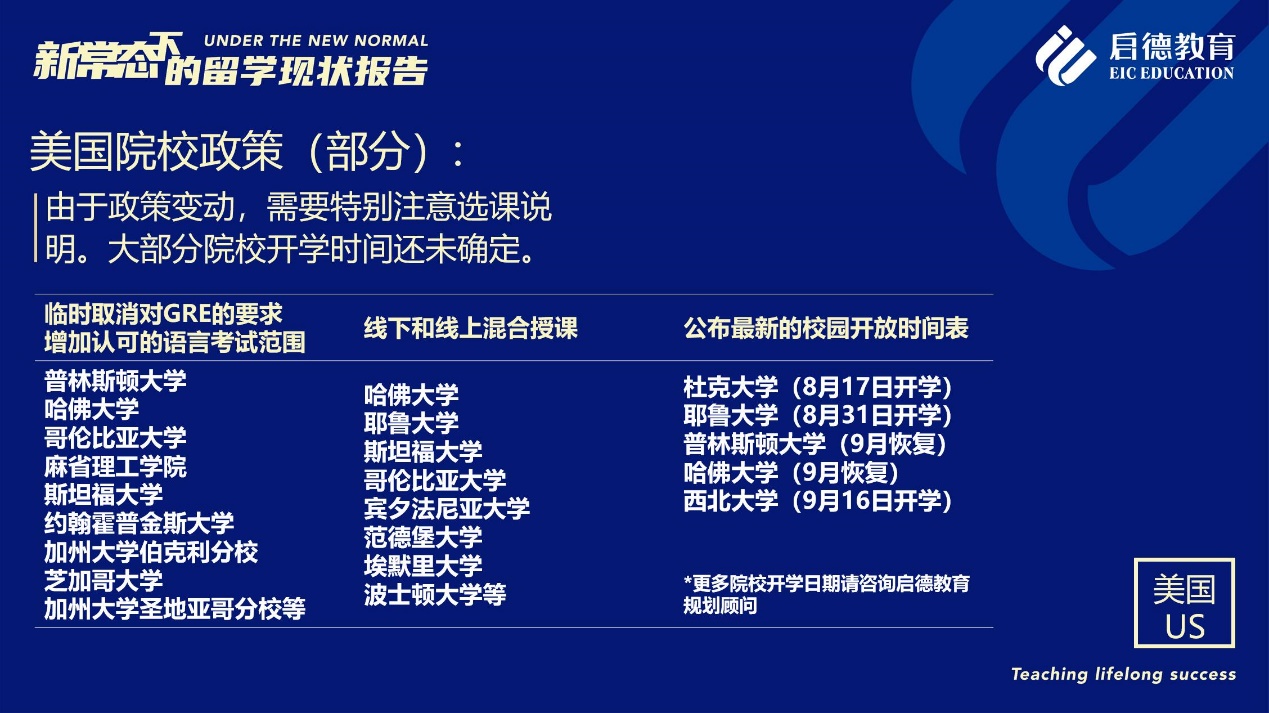 《報(bào)告》也梳理了近期各主要留學(xué)目的國及院校針對國際學(xué)生出臺(tái)的各類政策。據(jù)啟德留學(xué)英愛項(xiàng)目總監(jiān)孫波介紹,國內(nèi)英國簽證中心已經(jīng)重新開放。準(zhǔn)備赴英讀研的學(xué)生,部分大學(xué)明確表示秋季可以正常開學(xué),大課將會(huì)采用線上授課的方式,小班授課線下進(jìn)行;還有部分大學(xué)向?qū)W生提供更加靈活的入讀方案,學(xué)生可以選擇9月入讀或者1月入讀。此外,從2021年開始,在英國完成博士學(xué)位的國際學(xué)生將會(huì)獲得3年有效期的 PSW工作簽證,本科生和碩士生可以獲得2年有效期的 PSW工作簽證。
