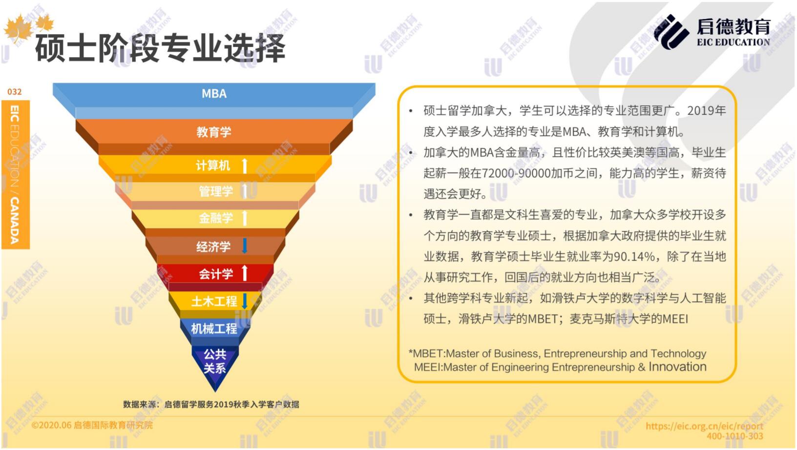 啟德加拿大2019秋季入學(xué)客戶服務(wù)數(shù)據(jù)顯示,在本科階段專業(yè)選擇理工科占比42%,商科占比37.1 %,文科19.1%,理工科的申請人數(shù)超過了商科。碩士階段選擇最多的專業(yè)是 MBA、教育學(xué)和計(jì)算機(jī),其他新興的跨學(xué)科專業(yè)包括滑鐵盧大學(xué)的數(shù)字科學(xué)與人工智能專業(yè)和商業(yè)、創(chuàng)業(yè)和技術(shù)專業(yè)( MBET ),麥克馬斯特大學(xué)的工程、創(chuàng)業(yè)與創(chuàng)新專業(yè)( MEEI )。