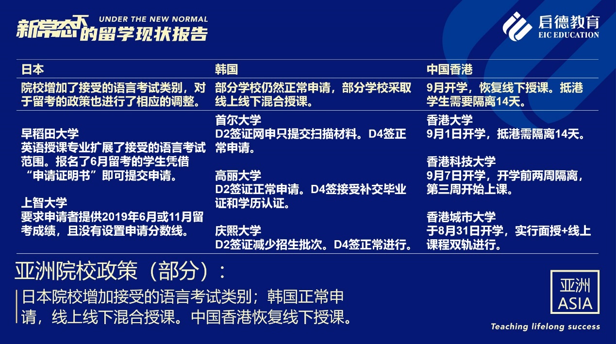 日本2020年入學(xué)學(xué)生的在留資格均已下發(fā),但針對留學(xué)生的入境政策目前還未最終公布。新加坡公立院校的新生留學(xué)簽證已正常批復(fù);私立院校的新生可以提交申請,但暫緩受理。據(jù)啟德留學(xué)亞洲項(xiàng)目總監(jiān)李陽介紹,中國香港、中國澳門地區(qū)秋季各院校均計(jì)劃如期復(fù)課,以網(wǎng)課+面授的形式完成第一學(xué)期課程。
