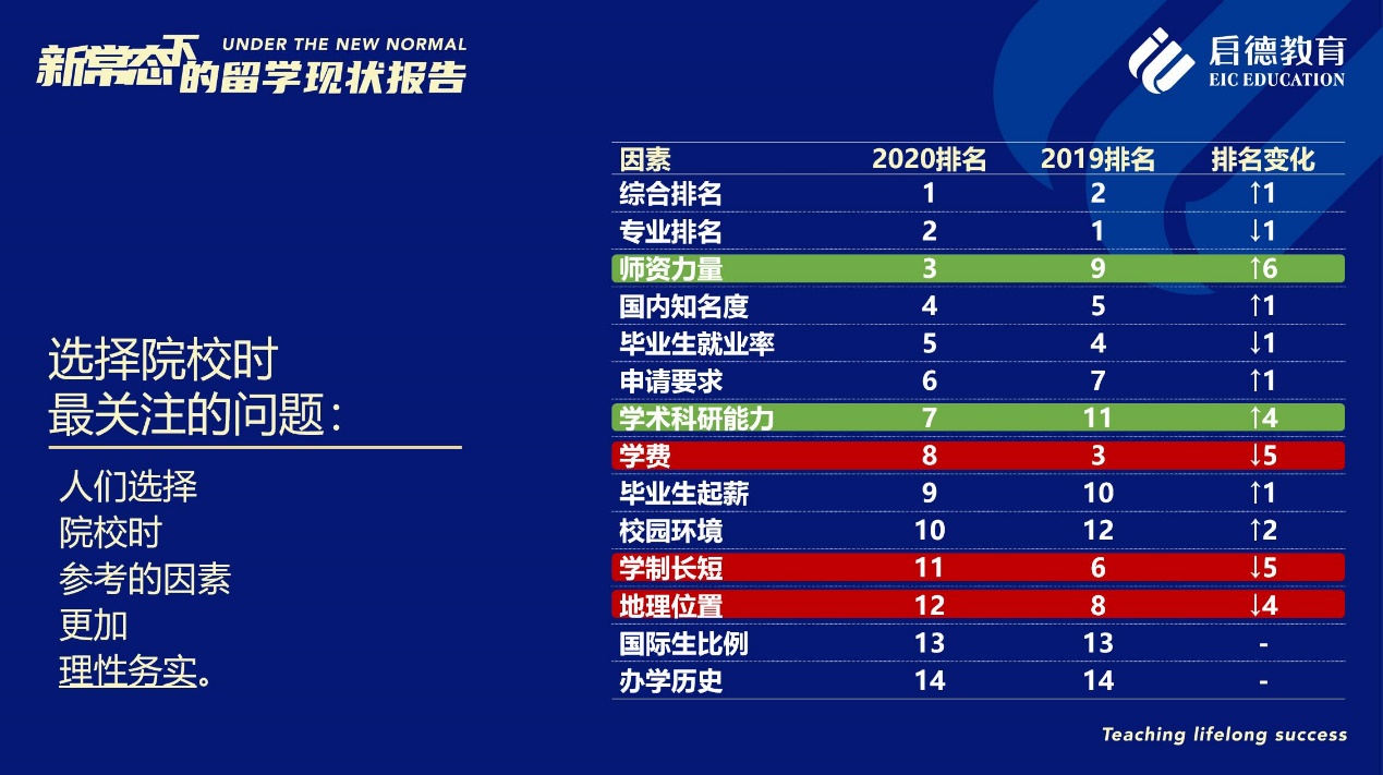 值得關(guān)注的是,在“選擇院校時(shí)最關(guān)注的問題”中,“師資力量”的受關(guān)注度從2019年的第9位上升為第3位,僅次于“綜合排名”與“專業(yè)排名”,“國內(nèi)知名度”與“畢業(yè)生就業(yè)率”分居第4位與第5位,“學(xué)術(shù)科研能力”從2019年的第11位上升至第7位,而“學(xué)費(fèi)”、“學(xué)制長短”與“地理位置”等因素分別下滑至第8位、第11位與第12位。可見在就業(yè)形勢尤其嚴(yán)峻的2020年,意向留學(xué)生對教育質(zhì)量的剛性需求已進(jìn)一步上升,以期在未來的就業(yè)市場獲得更具戰(zhàn)略優(yōu)勢的國際競爭力。
