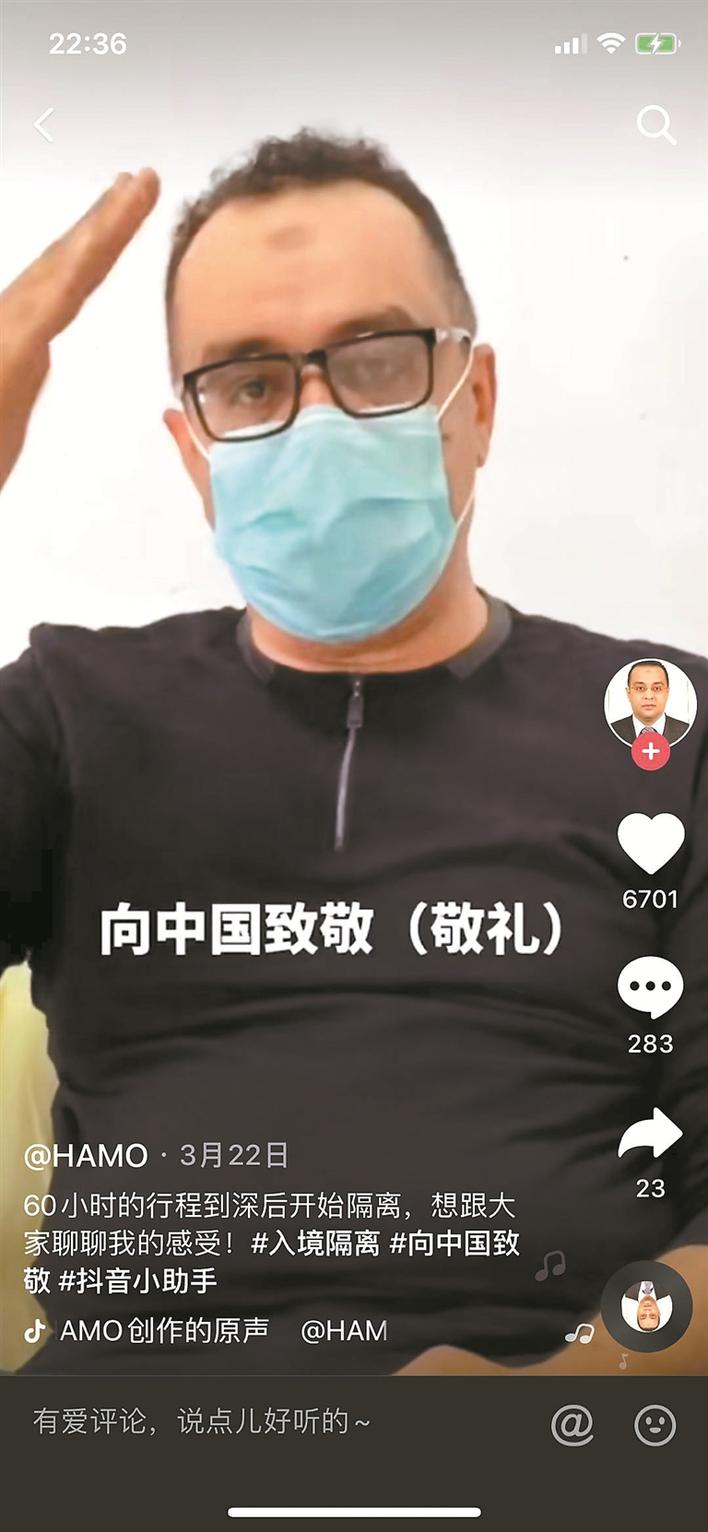 而在另一邊,方哈默也自愿當(dāng)起了中國防疫宣傳大使,他用短視頻在抖音記錄了中國抗疫暖心舉措,向國內(nèi)外宣傳羅湖各項(xiàng)防疫措施,截至目前,他在抖音已收獲了2.4萬的點(diǎn)贊量。網(wǎng)友們紛紛留下了暖心的鼓勵“謝謝你的理解”“歡迎你來到中國”?!拔蚁壬莻€(gè)比較開朗的人,也很喜歡中國的生活環(huán)境,喜歡中國人,我們周圍的鄰居、朋友對我們很好,沒有因?yàn)楝F(xiàn)在的疫情就歧視外國人或不敢靠近。所以他的心態(tài)一直都不錯(cuò)?!狈焦奶嬖V記者,其實(shí),對于她的丈夫來說,中國已經(jīng)是他的第二個(gè)家鄉(xiāng)。在疫情發(fā)生以來,他一直孜孜不倦地向所有朋友分享著中國政府在此次疫情中所做的努力和貢獻(xiàn)。
