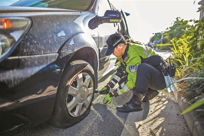 鐵騎民警在烈日下幫車(chē)主陳先生換輪胎。