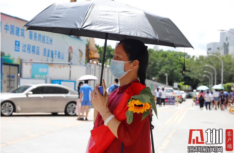 一位拿著旗幟和向日葵望著考點的家長。