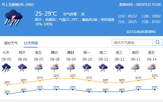 見圳客戶端·深圳新聞網(wǎng)2020年8月5日訊 今日我市陰天,有暴雨;氣溫25-29℃;偏南風(fēng)3級(jí);相對(duì)濕度70%-100%。深圳市氣象臺(tái)于2020年8月5日5時(shí)15分在全市發(fā)布雷電預(yù)警,今天上午海上將不斷有降雨云團(tuán)生成,受其影響我市有零散雷暴;未來(lái)6小時(shí)累計(jì)雨量將達(dá)暴雨,深圳市氣象臺(tái)于2020年8月5日5時(shí)40分在全市發(fā)布暴雨黃色預(yù)警,全市進(jìn)入暴雨戒備狀態(tài),需注意防范。市民停留在安全地方;按照防御預(yù)案停止戶外易燃易爆危險(xiǎn)作業(yè),并加強(qiáng)危化場(chǎng)所安全管理。