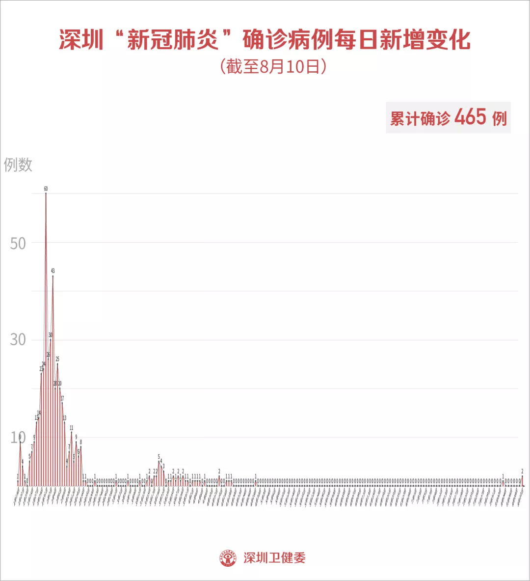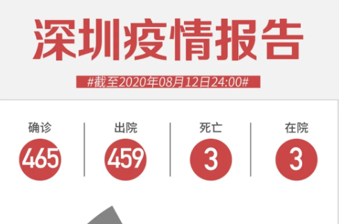 截至8月10日24時,深圳市累計報告新冠肺炎確診病例465例。目前在院3例。