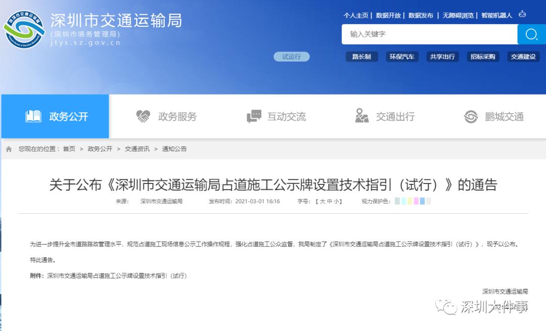 為加強道路管理,規(guī)范道路占用、挖掘行為,強化占道施工公眾監(jiān)督,深圳市交通運輸局編制了《占道施工公示牌設置技術(shù)指引(試行)》(以下簡稱《指引》),對占道施工公示牌設置要求,張貼范圍都有了明確的標準和要求。