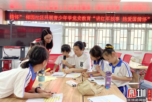 活動(dòng)現(xiàn)場,社工采用常規(guī)教研學(xué)習(xí)方式以講述紅軍長征故事《張思德“嘗百草”》《女戰(zhàn)士小董》等為切入點(diǎn),讓孩子們?cè)诿科适吕飳W(xué)習(xí)革命烈士的事跡。