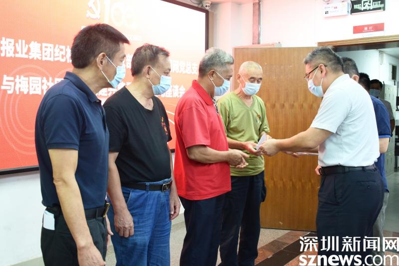 黨課結(jié)束后,陳鵬等代表深圳報業(yè)集團一行對社區(qū)老黨員進行慰問,并向老黨員代表送上慰問金和禮包,隨后,陳鵬向梅園社區(qū)“光榮在黨50年”老黨員們頒發(fā)紀念章,“你們辛苦了,我們要向你們學習,希望你們注意身體,繼續(xù)為社區(qū)做貢獻。”陳鵬捧起紀念章,為老黨員們戴上,并對老黨員們送上關(guān)心和祝福。