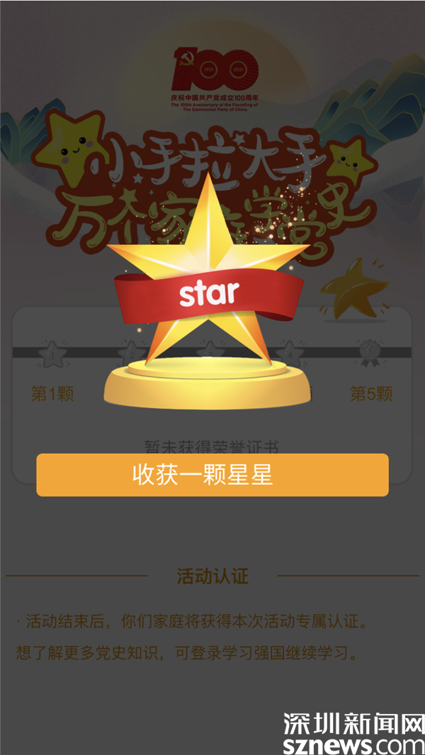 本次活動面向羅湖轄區(qū)中小學學生及家庭。6月28日至7月8日,學生及家長可以下載“羅湖Plus”APP,點擊首頁“服務”進入“小手拉大手黨史學習”活動專欄并完成注冊?;顒悠陂g,每完成1次打卡即答對全部題目,可獲得1次親子“點亮星星”的機會。每輪答題如有1道答錯即為“闖關失敗”,可以點擊“再來一次”繼續(xù)答題,直到全部答對為止。10天內完成5次打卡任務,即可點亮5顆小星星獲得“升旗手”個人榮譽證書。