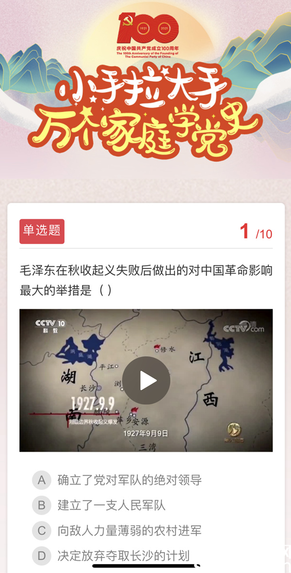 此次羅湖區(qū)率先通過區(qū)級融媒客戶端創(chuàng)新推出黨史學習教育“親子學習”模式,學生及家長共同參加,將黨史學習和家庭教育結合。題目類型上創(chuàng)新“圖+文+影”多種形式,包括看圖文答題,觀看革命題材電影片段等,題目內容涵蓋黨史、新中國史、創(chuàng)建文明城市等。