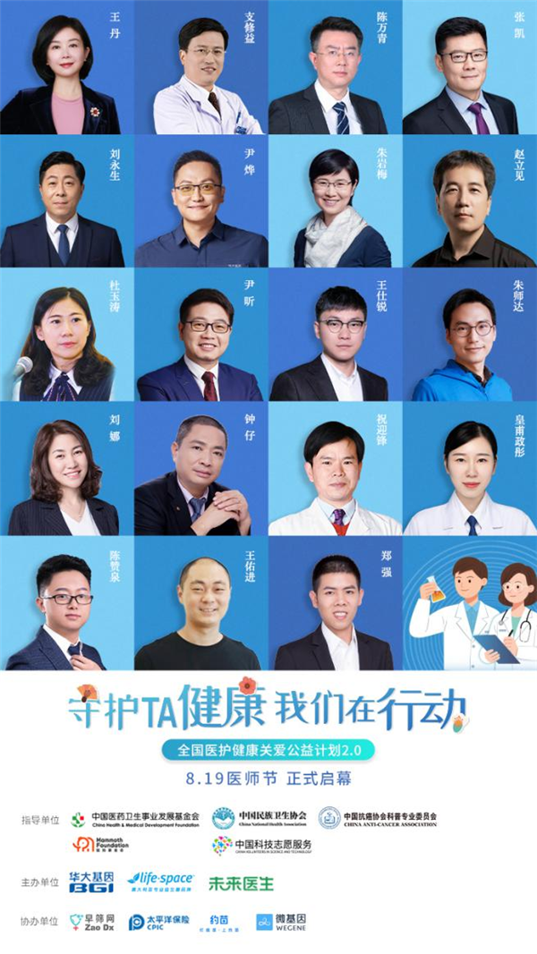 此次公益由中國(guó)醫(yī)藥衛(wèi)生事業(yè)發(fā)展基金會(huì)、中國(guó)民族衛(wèi)生協(xié)會(huì)、中國(guó)抗癌協(xié)會(huì)科普專(zhuān)業(yè)委員會(huì)、深圳猛犸公益基金會(huì)等機(jī)構(gòu)指導(dǎo),華大基因、Life-Space、未來(lái)醫(yī)生聯(lián)合主辦,早篩網(wǎng)、太平洋保險(xiǎn)、約苗、微基因協(xié)辦,通過(guò)健康關(guān)懷禮包捐贈(zèng)、公益科普直播、線(xiàn)上義診等系列活動(dòng),呼吁全社會(huì)關(guān)愛(ài)醫(yī)護(hù)人員,助力全社會(huì)形成“尊醫(yī)重衛(wèi)”的文化和氛圍;同時(shí)借助公益影響力,讓關(guān)愛(ài)輻射更廣泛人群,提高全民“早篩、早診、早治”的健康意識(shí),助力健康中國(guó)。