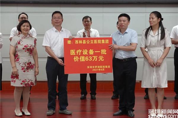 鄉(xiāng)村振興,關(guān)鍵在人,醫(yī)療和教育等基礎(chǔ)設(shè)施同樣起不可或缺的作用。此次考察中,羅湖區(qū)向西林縣人民醫(yī)院捐贈(zèng)了一批醫(yī)療設(shè)備。據(jù)了解,自2017年對(duì)口幫扶西林縣以來,羅湖區(qū)共派出8批醫(yī)療隊(duì)、92人次駐點(diǎn)西林縣各醫(yī)療衛(wèi)生單位,累計(jì)捐贈(zèng)價(jià)值約1000萬元的醫(yī)療儀器和設(shè)備,充分保障了地方百姓的醫(yī)療需求,推動(dòng)了西林縣公立醫(yī)院集團(tuán)的發(fā)展。
