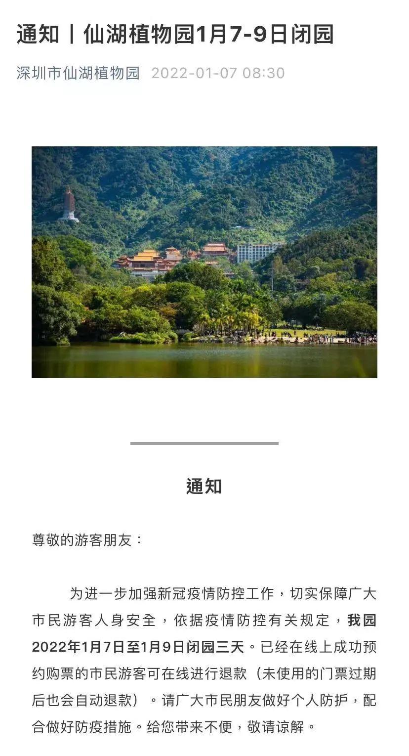 據(jù)深圳市仙湖植物園官方微信號(hào)1月7日8點(diǎn)30分發(fā)布的通知, 為進(jìn)一步加強(qiáng)新冠疫情防控工作,切實(shí)保障廣大市民游客人身安全,該園1月7日至1月9日閉園3天。已經(jīng)在線(xiàn)上成功預(yù)約購(gòu)票的市民游客可在線(xiàn)進(jìn)行退款(未使用的門(mén)票過(guò)期后也會(huì)自動(dòng)退款)。