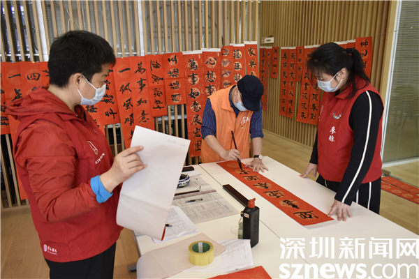 寫春聯(lián),是筆尖上歷久彌香的年味,是記憶里紅紅火火的祝福,是民俗中傳承的瑰寶?;顒?dòng)現(xiàn)場(chǎng),書寫春聯(lián)的劉老師熱情高漲,筆落有序,書寫過程行云流水、一氣呵成,一幅幅空白對(duì)聯(lián)在他們執(zhí)筆揮舞的手中仿佛也有了生氣。而身穿紅色馬甲的義工們則將書寫好的春聯(lián)進(jìn)行晾曬、收集、打包,大家分工合作,井然有序。愿這一副副在巧手下出爐的寓意平安和諧、吉祥如意的春聯(lián),一張張紅彤彤的“?!弊郑o社區(qū)居民帶去春的溫暖、年的祥和。
