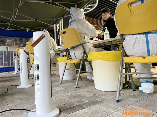 十分鐘后,物資配送車輛來到萬科里核酸檢測點(diǎn),工作人員將熱乎乎的姜茶送到工作人員手中,并熟練地尋找合適的地方架起暖風(fēng)機(jī)?!皬闹苣┑呐瘜殞?,到今天的暖風(fēng)機(jī),暖心行動一再升級,感覺很驚喜?!绷_湖醫(yī)院護(hù)士劉新媚向記者說道,目前疫情防控工作任務(wù)艱巨,檢測點(diǎn)周末也在連續(xù)運(yùn)轉(zhuǎn),但街道及時(shí)的物資保障,讓所有一線人員都感覺很暖心。