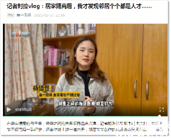 住在華瑞大廈A座封控區(qū)的第一現(xiàn)場記者楊語然,每天拍攝視頻記錄封控生活。在她的鏡頭下,封控區(qū)防疫工作有條不紊,民生服務(wù)暖心到位,鄰里之間抱團(tuán)取暖、相互打氣。她表示,因為這段“特殊的”居家隔離時光,鄰里之間的關(guān)系反而迅速升溫,每天在微信群里互動,才知道住在一起的鄰居們那么多才多藝。