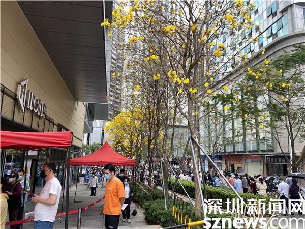 在國速中心廣場,黃花鈴木開得正好,藍天白云下是有序的核酸檢測隊伍,“大白”和“小藍”們正忙碌不停。據(jù)悉,這是桂園街道所屬的松園社區(qū)的一個核酸檢測點,地處于商業(yè)旺區(qū)附近,人口較多,所以核酸檢測隊伍也相對其他核酸檢測點長。羅湖區(qū)政協(xié)委員、深圳市國速房地產(chǎn)開發(fā)有限公司董事長黃少兵表示,這個核酸檢測點從1月初就設(shè)立了,“由于國速中心廣場較寬敞,滿足了通風(fēng)和人流需求。”