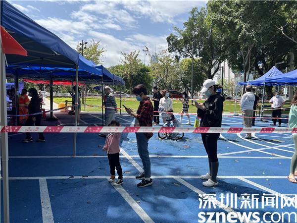 在做好居民告知工作的同時(shí),社區(qū)也在緊鑼密鼓地開展核酸檢測工作,確保全員核酸檢測穩(wěn)步有序。記者在初心公園核酸檢測點(diǎn)看到,現(xiàn)場分為等候區(qū)、登記區(qū)、采樣區(qū),等候區(qū)的隊(duì)伍長而有序,沿途設(shè)置了溫馨提示,居民提前準(zhǔn)備好粵康碼、粵核酸碼。在等候區(qū)的盡頭,有引導(dǎo)員按照10人一組引導(dǎo)至登記區(qū),并由信息采集員采集居民信息,隨后引導(dǎo)至采樣區(qū)進(jìn)行核酸采樣。整個過程,居民紛紛佩戴口罩、保持一米距離,保持安靜等候,遇到掃碼等困難,現(xiàn)場有志愿者及時(shí)幫助解決。
