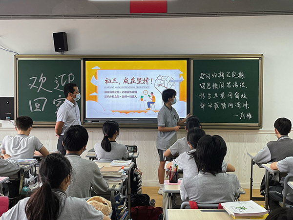 教室里,“歡迎回家”的字眼撥動學(xué)生們返校的心弦。班主任自創(chuàng)的一首無題小詩,將學(xué)生們的線上時光與線下相見相串聯(lián),潛移默化中過渡著焦慮,拉近著距離,蘊藏著無限激勵!