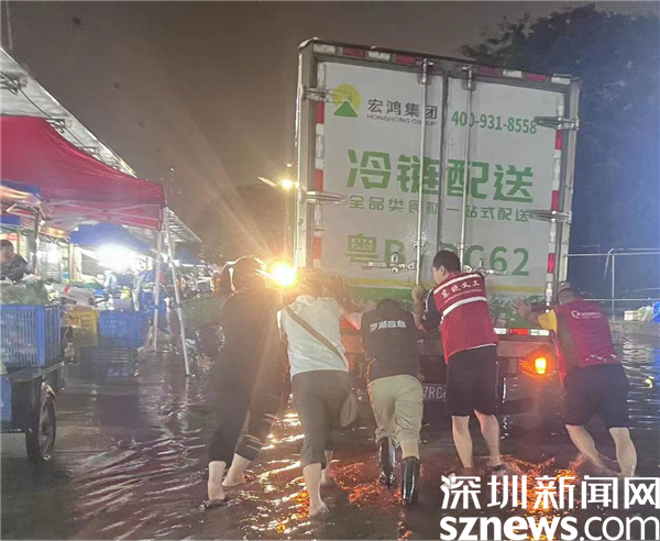 在蘭花社區(qū)豐湖大廈果蔬集散市場(chǎng),有三輛農(nóng)產(chǎn)品運(yùn)輸車(chē)拋錨,在接到求助信息后,蘭花社區(qū)黨委副書(shū)記鄒添文和其它值班同事立即趕往現(xiàn)場(chǎng),冒雨將車(chē)輛推離市場(chǎng)?!皬?月11日上午9點(diǎn),到5月12日上午9點(diǎn),我一直在崗。我們對(duì)社區(qū)進(jìn)行了全面排查,確保暴雨期間居民的生命和財(cái)產(chǎn)安全?!编u添文在接受記者采訪時(shí)表示,“凌晨三點(diǎn),我們還在市場(chǎng)處理拋錨車(chē)輛,那時(shí)候也是雨勢(shì)最為迅猛的時(shí)候,雖然大家都變成了落湯雞,身上又冷又膩特別難受,但是看到車(chē)輛成功駛離,還是很有成就感的。”