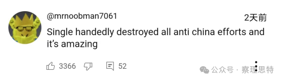 在YouTube上,“單槍匹馬摧毀了所有的反華努力,這太神奇了”“中國被低估了,簡直難以置信”“這次旅行是中國有史以來最好的宣傳”“在我看來深圳是中國最好的城市。有邁阿密的天氣、空氣和景觀,有紐約的摩天大樓,有上海的國際氛圍,有重慶的科技和賽博朋克美學(xué),還帶點廣東味”這樣的感嘆不勝枚舉。