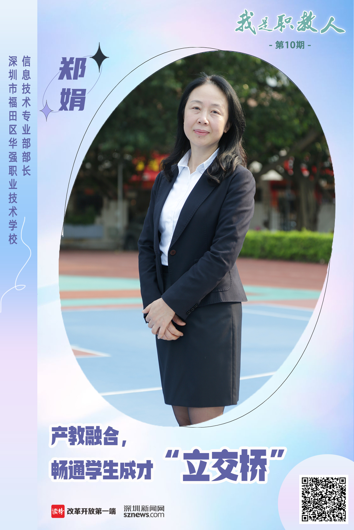 父母的耳濡目染,讓她選擇成為一位教師;職業(yè)教育發(fā)展的重要性,讓她成為了一名職教人,她是深圳市福田區(qū)華強職業(yè)技術學校(以下簡稱“華強職?!保┬畔⒓夹g專業(yè)部部長鄭娟。