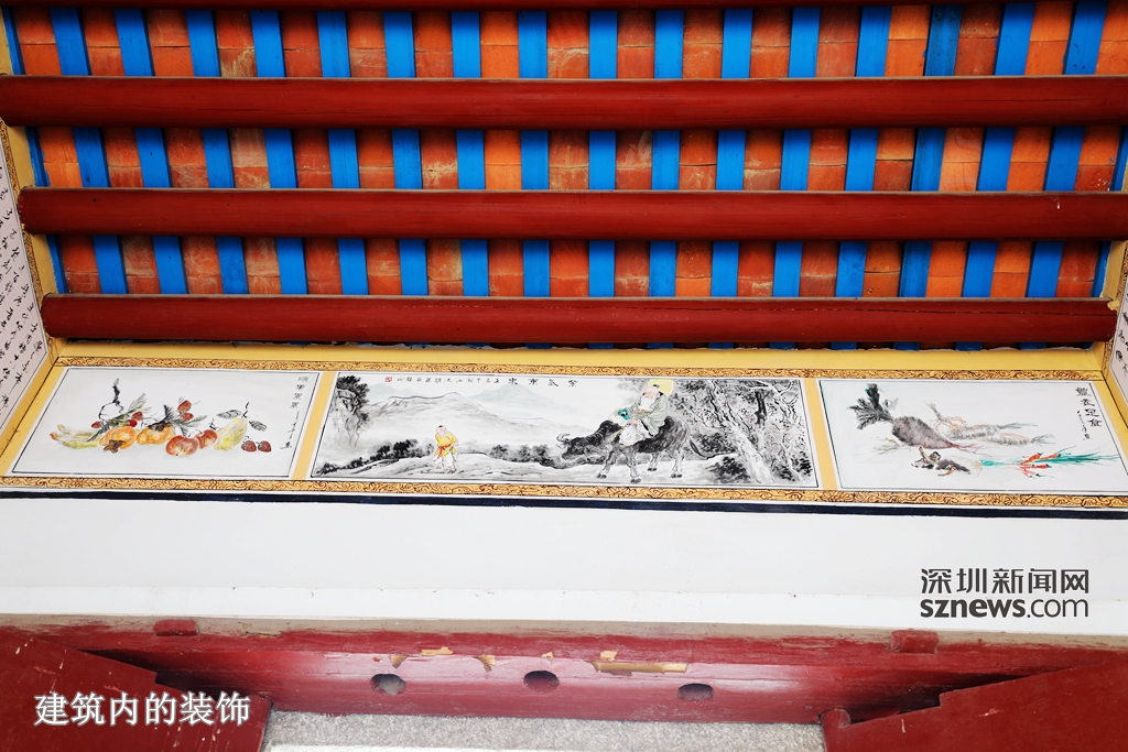 客家圍屋被稱(chēng)為“東方城堡”,西埔新居的建造者們同樣也嚴(yán)格遵循古法“造城”,近3米高的白褐色外墻將99間房屋圍成一個(gè)方形堡壘,如同一座城堡。圍屋核心的李氏宗祠歷經(jīng)歲月洗禮,屋頂飛檐飾以仙鶴、麒麟、鹿等吉祥物,外壁上繪著山水畫(huà),宗祠內(nèi)雕梁畫(huà)棟。以李氏祠堂為中軸線,左右對(duì)稱(chēng)的99間居民房屋成行成列。圍屋內(nèi)巷道縱橫交錯(cuò),居民家內(nèi)收拾得干干凈凈,很是整潔,門(mén)口還種有花草,生活的樂(lè)趣撲面而來(lái)。