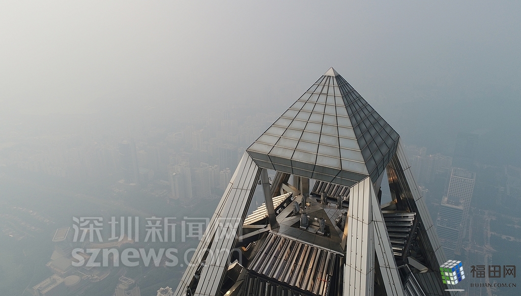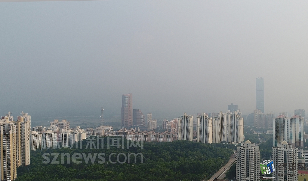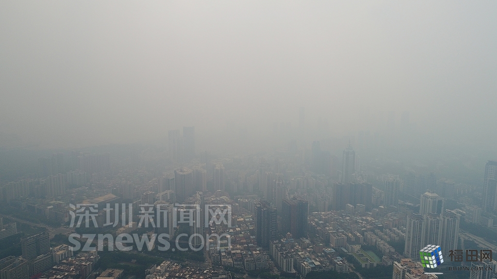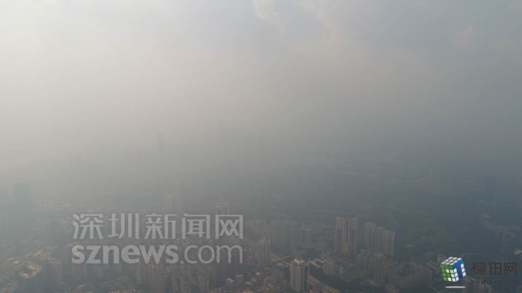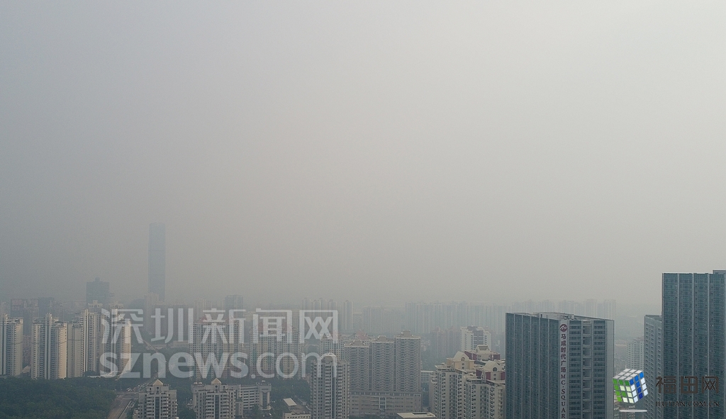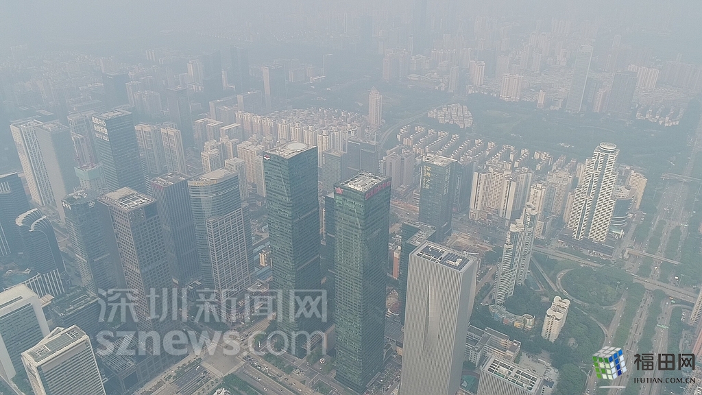 無(wú)人機(jī)在數(shù)百米高空俯瞰灰霾籠罩下的深圳中心區(qū),大半個(gè)城區(qū)都看不清楚。