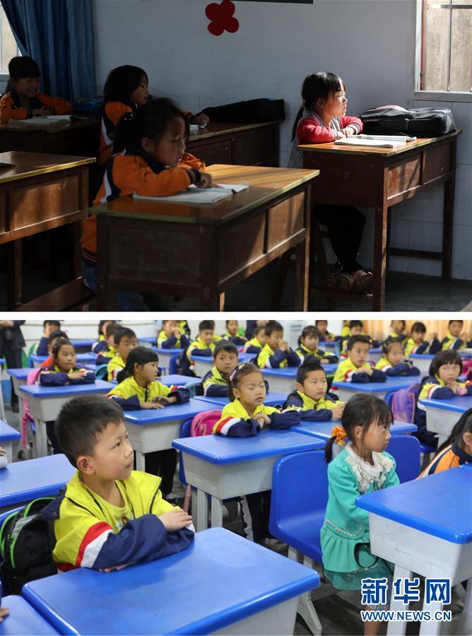 拼版照片:上圖為7歲的李曉彤(右一)在華山小學(xué)教室內(nèi)晨讀(4月27日攝);下圖為7歲的李曉彤(前排左二)在黔西縣第十小學(xué)教室內(nèi)上課(5月7日攝)。貴州省黔西縣金蘭鎮(zhèn)瓦房村哈沖組位于六沖河岸邊的崖壁下,哈沖組的孩子們每天要往返崖壁上的山路才能到達(dá)華山小學(xué)就讀。28年來,崖壁上約4公里山路成了當(dāng)?shù)孛缱鍖W(xué)生艱難危險(xiǎn)的求學(xué)路。 5月5日起,哈沖組里的苗族同胞陸續(xù)通過易地扶貧搬遷至縣城的錦繡花都安置點(diǎn),孩子們也陸續(xù)搬至黔西縣第十小學(xué)就讀。自此,孩子們的上學(xué)路從約2個(gè)小時(shí)艱難跋涉的崖壁山路變?yōu)椴叫兄恍枰胄r(shí)的公路。求學(xué)之路“天塹變通途”,哈沖組村民幾代人的崖壁求學(xué)路成為歷史。新華社記者歐東衢攝