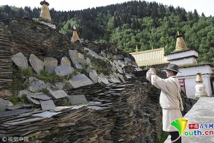 在四川阿壩州壤塘縣棒托寺內(nèi)珍藏約50萬片明清時期鐫刻的大藏經(jīng)《甘珠爾》和《丹珠爾》,大藏經(jīng)左高9.7米,右高9.2米,長46米、左寬160米,右寬13米,占地598平方米,是目前全世界保存最完整、規(guī)模最宏大、內(nèi)容最豐富的石刻大藏經(jīng)孤品。據(jù)史料記載,由明末清初60余名石匠辛勤鐫刻9年而成。石刻藏文經(jīng)書圖文并茂,筆法流暢,疏密有致,陰陽相背,滿版生輝。具有極高的文物和藝術(shù)研究價值。圖為堆積的石刻大藏經(jīng)孤品。圖片作者/視覺中國
