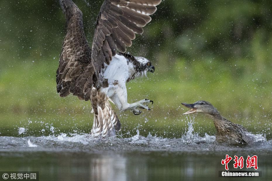 2018年6月21日訊(具體拍攝時(shí)間不詳),英國蘇格蘭高地,一只憤怒的綠頭鴨襲擊一只捕食的魚鷹。攝影師Andy Howard對于當(dāng)時(shí)眼前的景象感到十分震驚,并用鏡頭記錄下來了整個(gè)打斗過程。母鴨最后跳到魚鷹背上,害得魚鷹不得不丟下到手的鱒魚落荒而逃。他表示,沒有發(fā)現(xiàn)任何明顯的原因會引發(fā)這場打斗,母鴨并沒有幼崽需要保護(hù),而魚鷹也不吃鴨子?!盀榱粟s在晨光出現(xiàn)時(shí)拍照片,我必須凌晨2點(diǎn)鐘就起床,但我當(dāng)時(shí)并不知道有這么精彩的一出戲在等著我?!?圖片來源:視覺中國