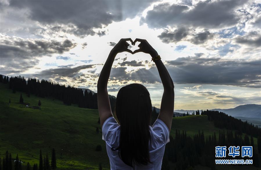 在那拉提景區(qū)天成臺(tái),一位游客迎著夕陽(yáng)做出了“心”的動(dòng)作(7月8日攝)。