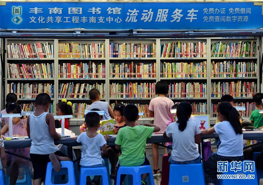 7月16日,唐山市豐南區(qū)金都花園社區(qū)的小朋友在流動服務(wù)車前翻閱圖書。