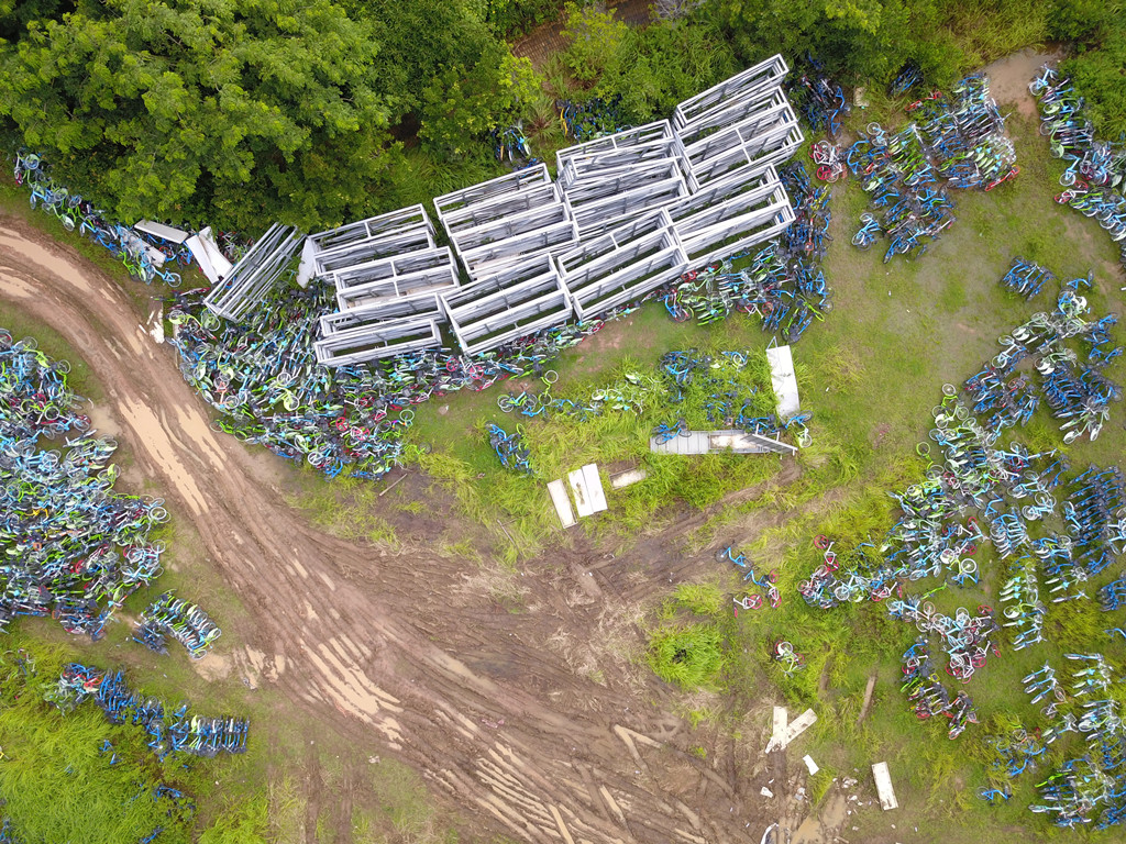 從高空中能夠看到,堆放的單車(chē)大多為目前無(wú)法正常運(yùn)營(yíng)的酷騎、小藍(lán)單車(chē)