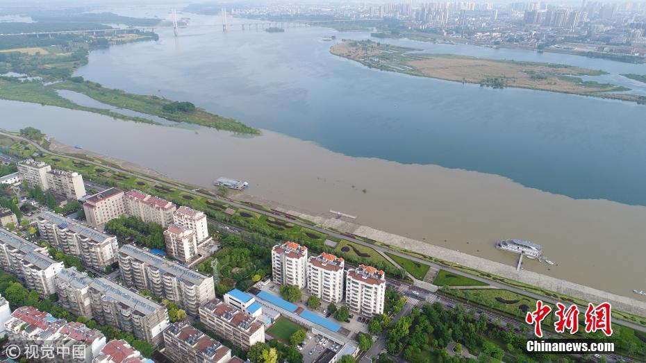 5月7日,湖北省襄陽市,無人機(jī)航拍的漢江長虹大橋處涇渭分明的漢江水面。強(qiáng)暴雨沖刷經(jīng)過去冬今春的田野地表積累的塵土,經(jīng)支流與主河道匯入時(shí),充滿污泥的洪水與主河道上清澈的丹江水形成難得一見的涇渭分明景觀。王虎攝 圖片來源:視覺中國