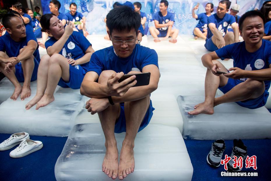 參賽選手們赤腳坐在“冰板凳”上,該環(huán)節(jié)還要接受淋冰水、吃冰棍及單腿站立的考驗。中新社記者 張暢 攝