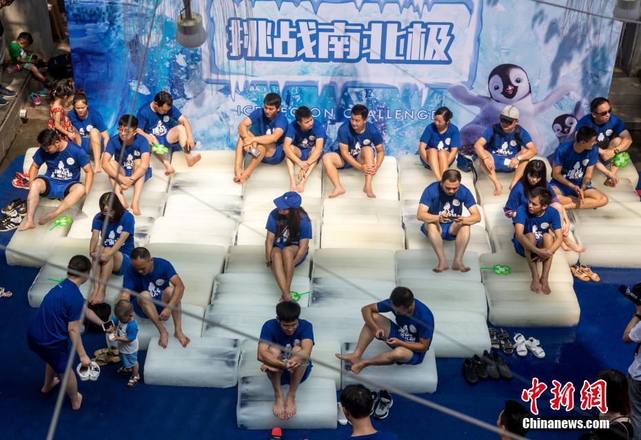 8月11日,在企鵝館舉行的決賽中,工作人員給參賽選手桶里加冰塊。當日,一場充滿趣味性的“冰極挑戰(zhàn)賽”在武漢海昌極地海洋世界上演,參賽者們經過“極地初體驗”和“極寒企鵝館耐寒挑戰(zhàn)”兩個環(huán)節(jié),堅持時間長者獲勝。中新社記者張暢 攝