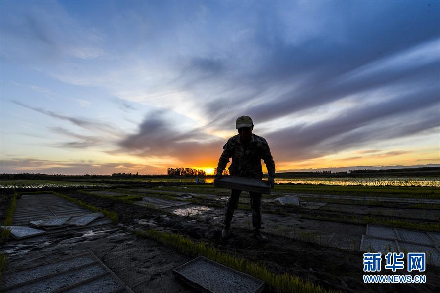 新疆察布查爾錫伯自治縣種羊場(chǎng)托海依村的村民在農(nóng)田里搬運(yùn)秧苗(5月21日攝)。近日,隨著氣溫漸高,地處新疆伊犁河谷的察布查爾錫伯自治縣迎來(lái)插秧高峰期,田間地頭一派繁忙景象。塊塊稻田水滿(mǎn)如鏡,田間防護(hù)林枝繁葉茂,遠(yuǎn)處雪山依稀可見(jiàn),如一幅在大地上鋪展開(kāi)的生態(tài)畫(huà)卷。新華社記者胡虎虎 攝